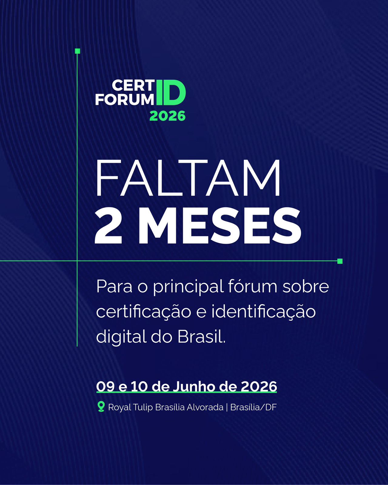 A contagem regressiva começou Faltam apenas 2 meses para o CertForum-ID 2026, o principal fórum sobre certificação e identificação digital do Brasil. Serão dois dias de debates, conexões, inovação e troca de experiências sobre os caminhos da confiança digital no país. Fique atento: as inscrições estarão abertas a partir do dia 13 de abril, no nosso site: www.certforumid.com.br. 📍 09 e 10 de junho de 2026📌 Royal Tulip Brasília Alvorada | Brasília/DF #CertForumID2026 #IdentificaçãoDigital #TransformaçãoDigital