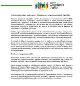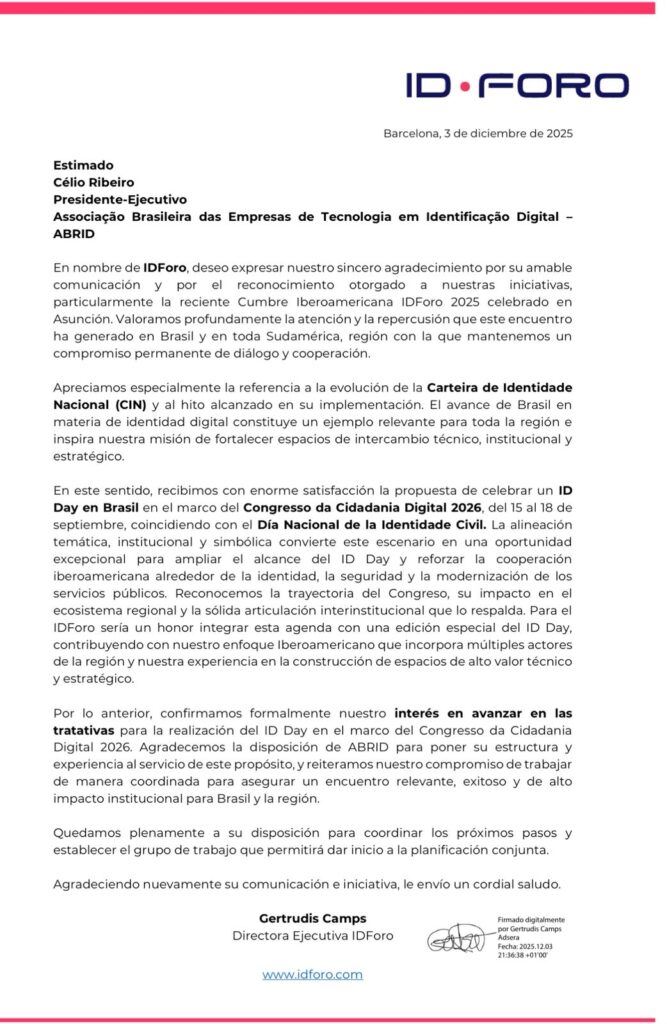 O Brasil receberá, em 2026, uma edição especial do ID Day, que será realizada durante o Congresso da Cidadania Digital (CCD 2026), promovido pela Associação Brasileira das Empresas de Tecnologia em Identificação Digital (ABRID), entre os dias 15 e 18 de setembro de 2026, em Brasília. A iniciativa marca o início da cooperação formal entre o ecossistema brasileiro de identidade digital e o IDForo, organização internacional dedicada ao diálogo técnico e estratégico sobre identidade, segurança e transformação digital na Ibero-América.