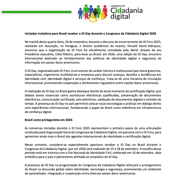 Nesse contexto, considera-se especialmente oportuno receber o ID Day no Brasil durante o Congresso da Cidadania Digital, que em 2026 será realizado de 15 a 18 de setembro. A escolha desse período está em sintonia com o Dia Nacional da Identidade Civil, celebrado em 16 de setembro, data simbólica para o país e plenamente alinhada ao propósito do ID Day.